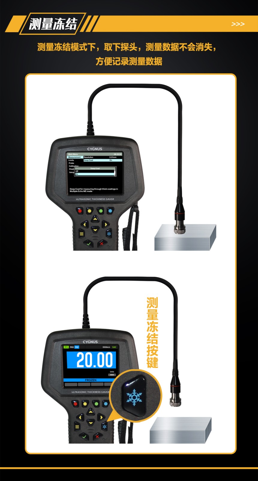 (2)雙重波模式適用于厚度達1mm的薄涂層嚴重腐蝕金屬測量,適合測量后壁腐蝕嚴重的涂漆金屬;(雙晶探頭)(1EX Pro)