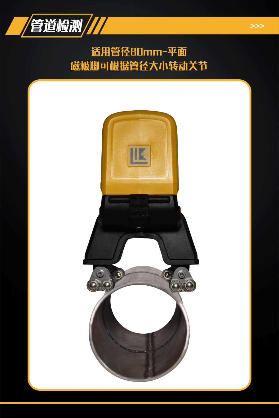 9、可檢測≥80mm以上直徑管道焊縫及平板焊縫;磁極腳為可轉動關節,可隨不同管徑的工件調節磁極角度,使磁極貼合管件弧面,保證探傷效果;配有管道焊縫、平板焊縫檢測2種規格磁極腳。