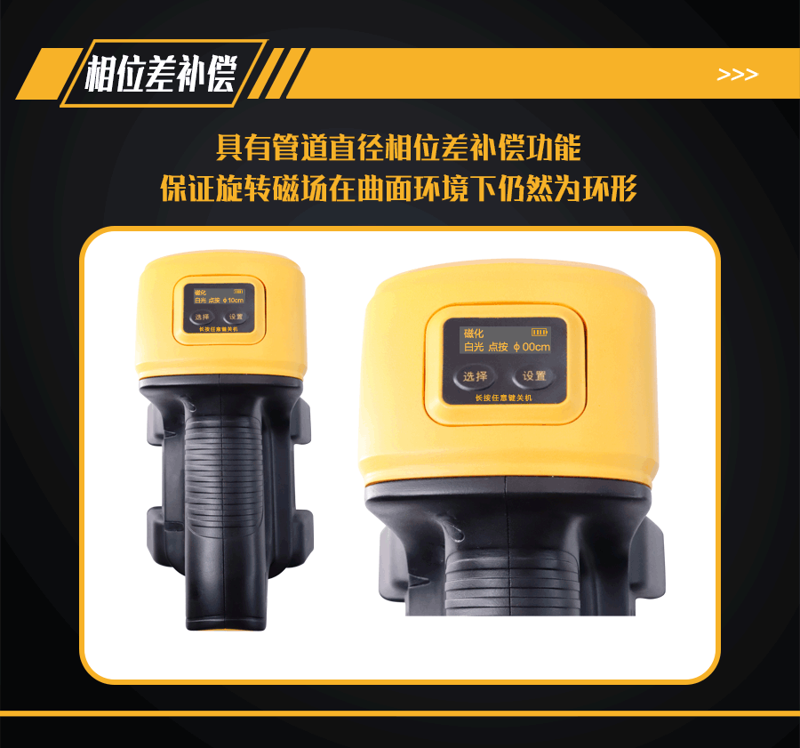 10、管道直徑相位差補償功能;檢測不同直徑管道,可在鋰電池電源OLED顯示屏上進行直徑選擇,設置對應管道直徑的相位差補償,保證旋轉磁場在曲面環境下仍然為環形。