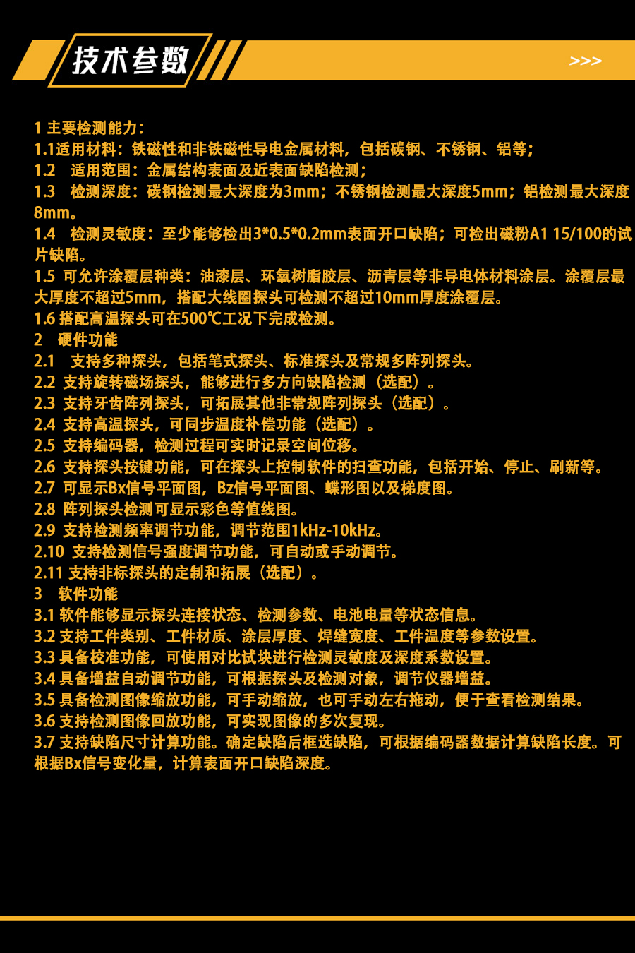 1、交流電磁場檢測技術適用各種導電體材料,主要用于鐵磁性或非鐵磁性材料對于表面或近表面的缺陷可以快速準確的檢出;