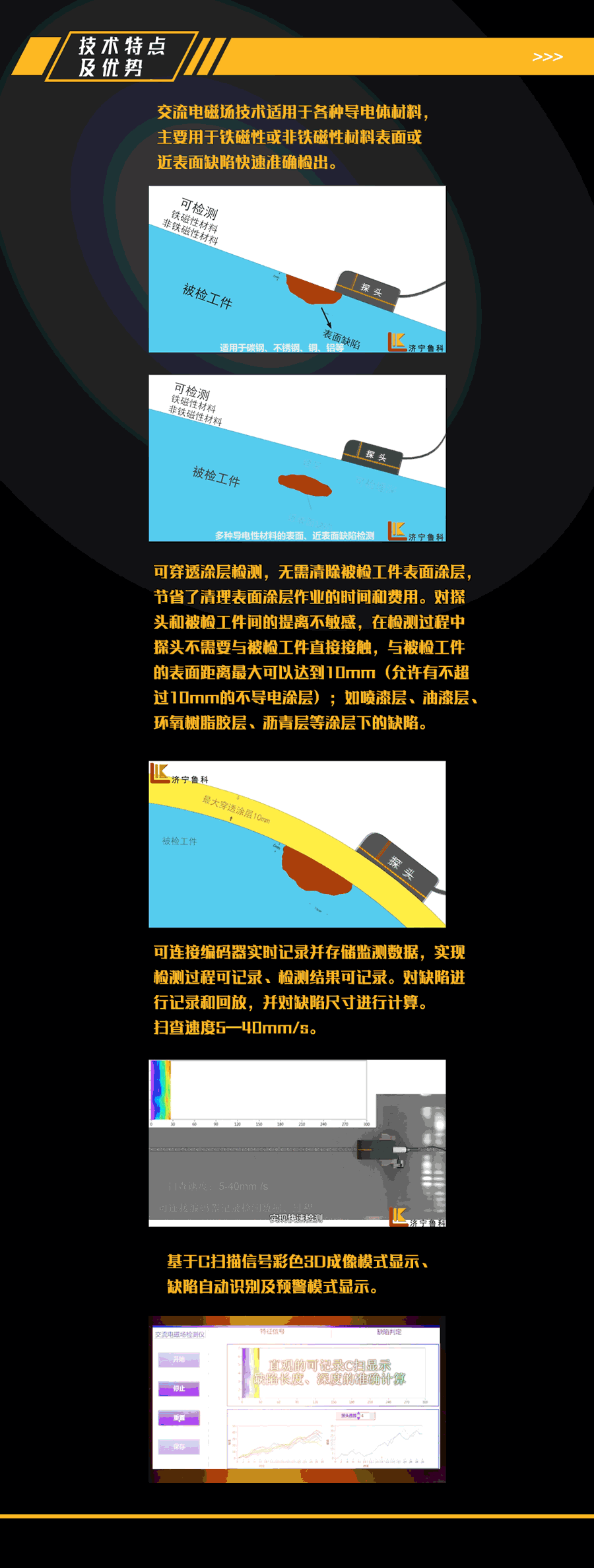 1、交流電磁場檢測技術適用各種導電體材料,主要用于鐵磁性或非鐵磁性材料對于表面或近表面的缺陷可以快速準確的檢出;