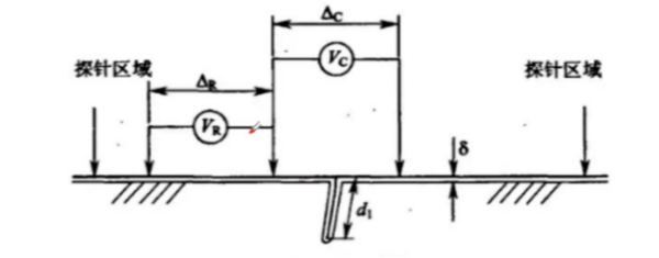 ACPD技術的原理并非基于電磁感應,而是利用交流電的趨膚效應。最簡單的ACPD檢測系統由兩根探針構成。檢測時,需先打磨待測區域,然后在區域兩側分別放置探針,并施加不同電壓的交流電。此時,探針、儀器與檢測區域共同構成閉合回路,電流從高電勢探針流向低電勢探針。由于趨膚效應,若檢測區域無缺陷,電流流經的路徑長度即為兩探針之間的距離;若存在表面開口缺陷,電流路徑將增加約兩倍的缺陷深度。路徑長度的變化可通過兩探針間的電壓變化來表征,并由儀器記錄,見圖2。