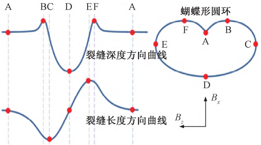 ACFM技術基于電磁感應原理,其核心思想是在被測導體表面施加均勻的交流電流(通常頻率在1-10kHz),電流在遇到缺陷(如裂紋)時會發生畸變,從而在缺陷周圍產生可測量的磁場擾動,如圖1所示。磁場信號變化與特征點對應如圖2所示。