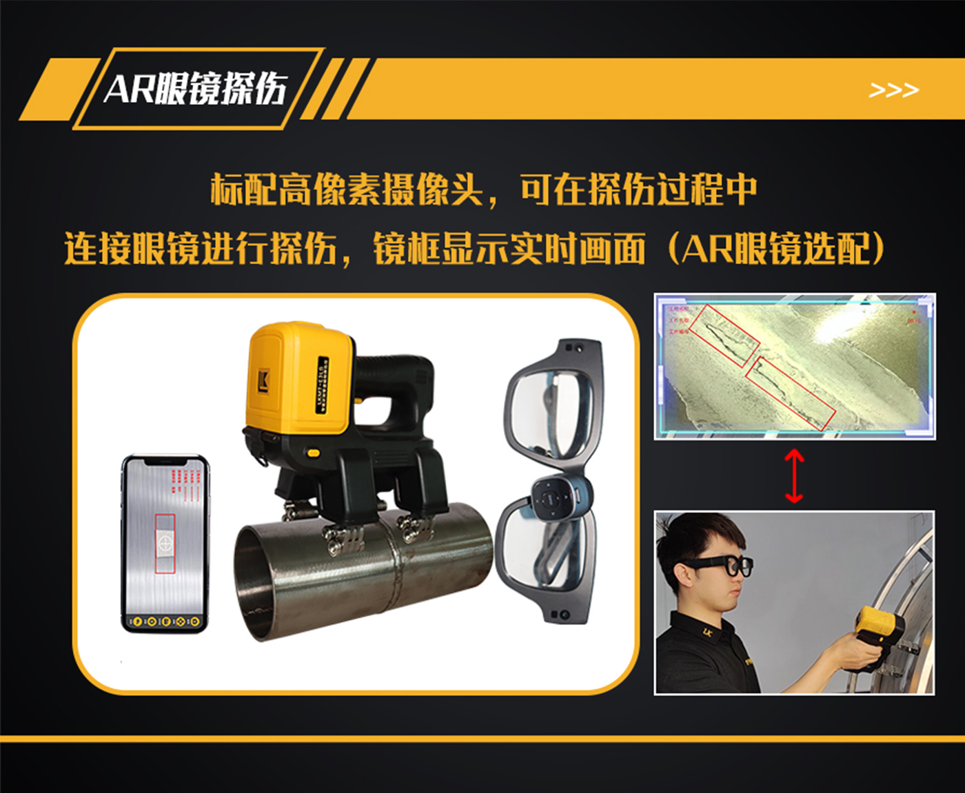11、探頭內部裝有500萬像素攝像頭,手機、平板電腦或AR眼鏡等手持終端安裝APP軟件,通過Wi-Fi與探頭鏈接,手持終端實時顯示探傷狀態;