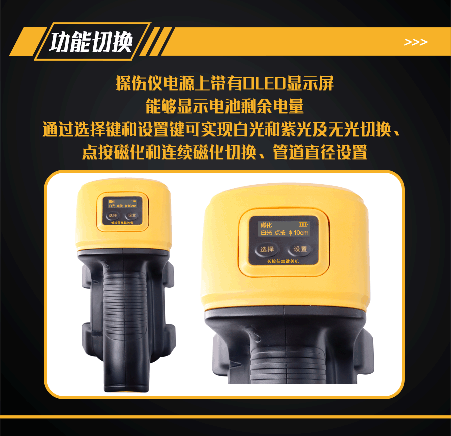 4、鋰電池電源帶有OLED顯示屏及操作按鍵;可顯示及設置剩余電量和電壓、點按磁化或連續磁化工作模式、紫外線或白光照明模式;